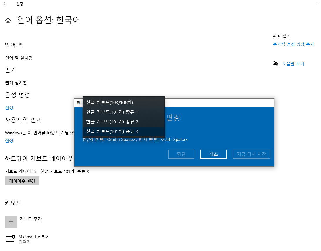 2. 한국어 -> 옵션 -> 하드웨어 키보드 레이아웃 -> 레이아웃 변경