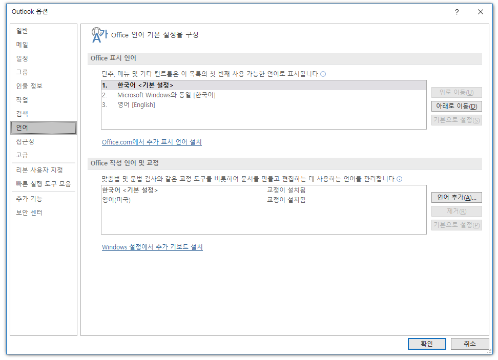 1. outlook -> file 메뉴 -> option -> language -> 한국어 추가 후 맨 위로 이동 ( 기본설정 )