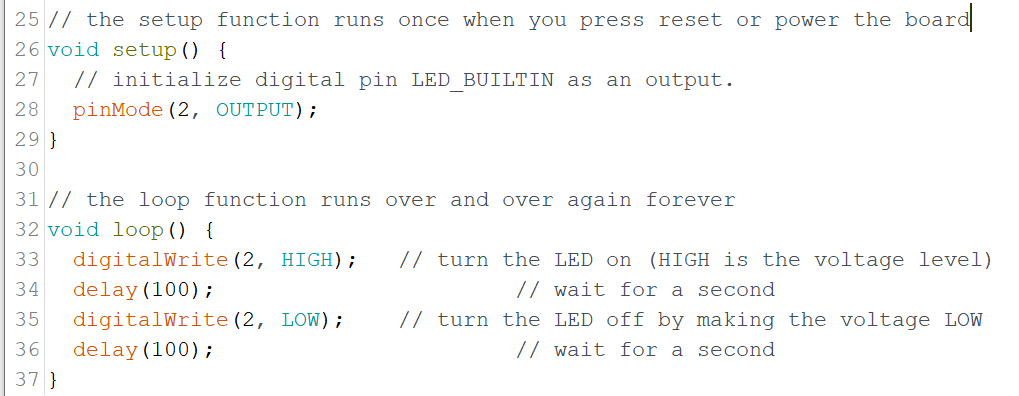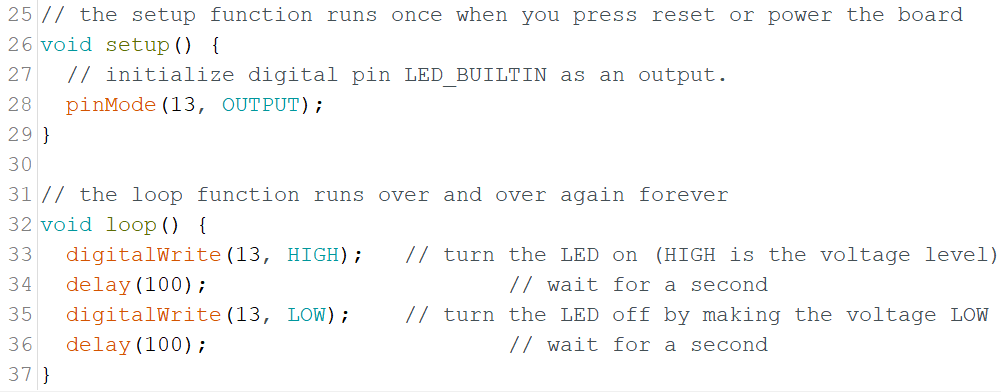 Example Code The code makes the digital pin 13 OUTPUT and Toggles it HIGH and LOW void setup() { pinMode(13, OUTPUT); // sets the digital pin 13 as output } void loop() { digitalWrite(13, HIGH); // sets the digital pin 13 on delay(1000); // waits for a sec