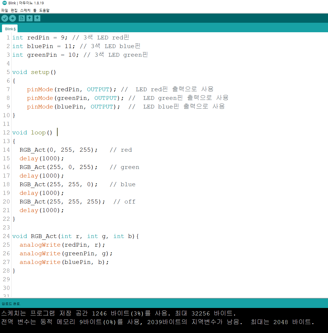 pinMode(bluePin, OUTPUT); // LED blue핀 출력으로 사용
