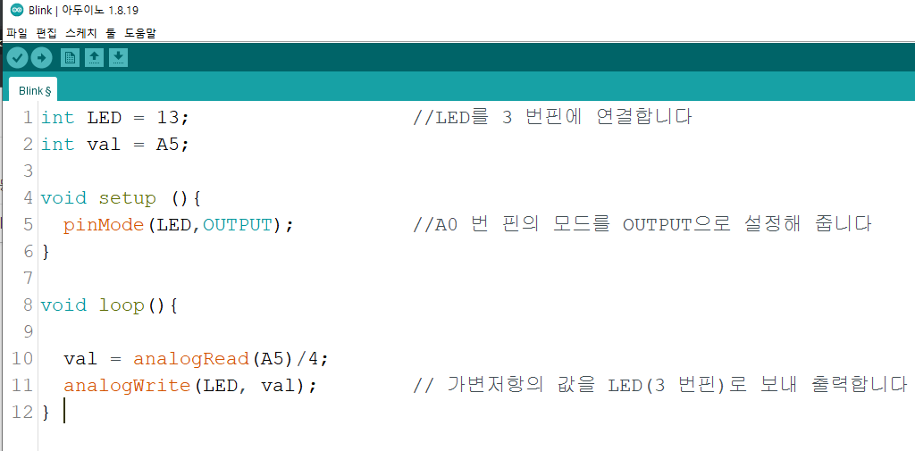 analogWrite(LED, val); // 가변저항의 값을 LED(3 번핀)로 보내 출력합니다