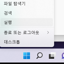 1. 시작 -> 마우스 오른쪽 클릭 -> 실행
