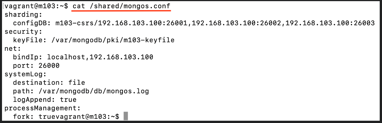 storage: dbPath: "/data/db" systemLog: path: "/data/log/mongod.log" destination: "file" replication: replSetName: M103 net: bindIp : "127.0.0.1,192.168.103.100" tls: mode: "requireTLS" certificateKeyFile: "/etc/tls/tls.pem" CAFile: "/etc/tls/TLSCA.pem" security: keyFile: "/data/keyfile" processManagement: fork: true