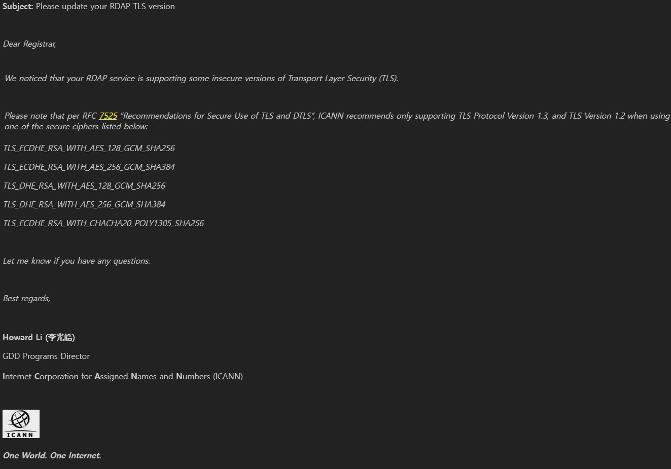 ICANN 에서 RDAP 서비스에 대해 TLS 1.3 으로 올리라는 안내 메일을 받아 내용을 기록해 둔다.