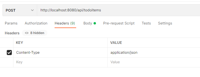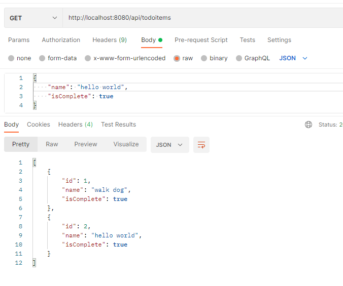 post -h Content-Type=application/json -c "{"name":"walk dog","isComplete":true}"