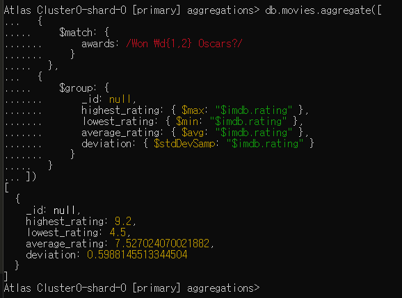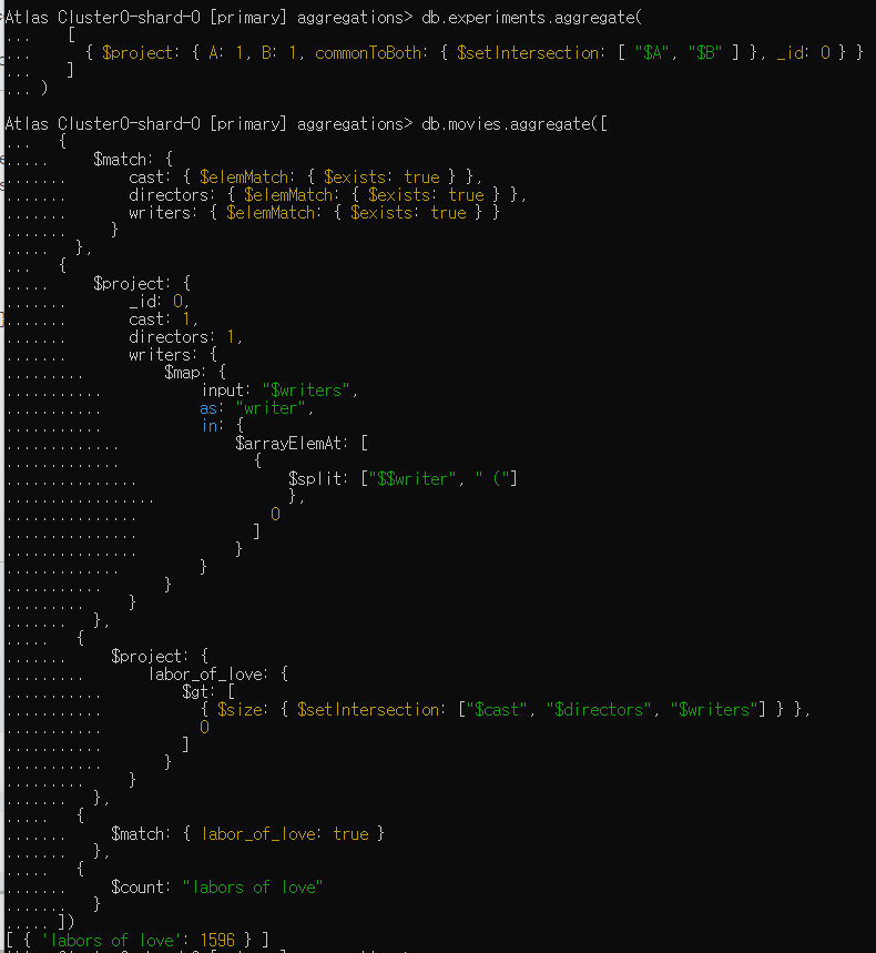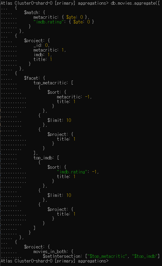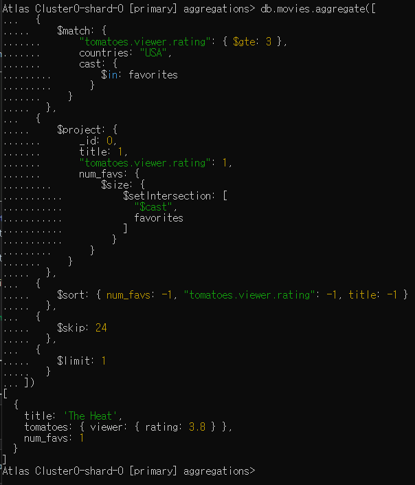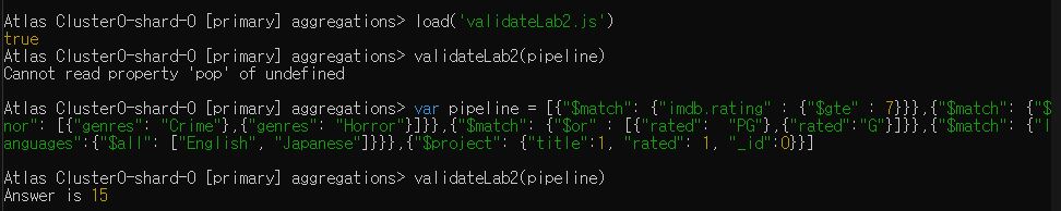 - As a hint, your aggregation should return 23 documents. You can verify this by typing db.movies.aggregate(pipeline).itcount()