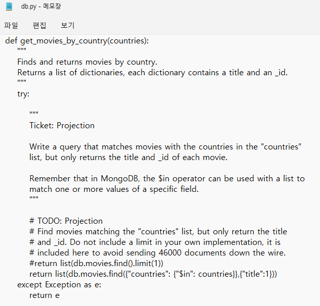 Implement the get_movies_by_country method in db.py to search movies by country and use projection to return the title and _id field. The _id field will be returned by default.