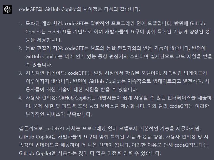 - 지속적인 업데이트: codeGPT는 일정 시점에서 학습된 모델이며, 지속적인 업데이트가 이루어지지 않습니다. 반면에 GitHub Copilot은 지속적으로 업데이트되고 발전하여, 사용자들이 최신 기술에 대한 지원을 받을 수 있습니다.