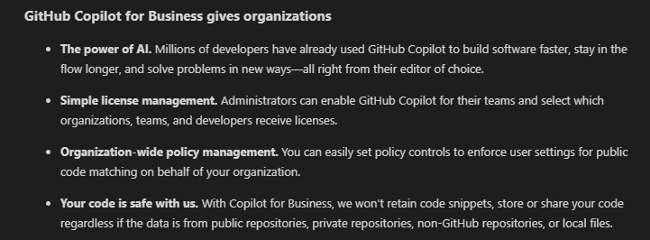 Copilot for Business를 사용하면 공개 저장소, 비공개 저장소, 비-GitHub 저장소 또는 로컬 파일에서 데이터가 비롯되었을 때도 코드 스니펫을 보관, 저장 또는 공유하지 않습니다.