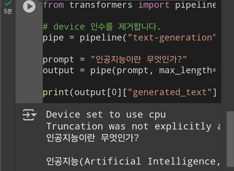 이 코드를 실행하면, DeepSeek 모델이 질문에 대한 자연스러운 답변을 생성합니다.