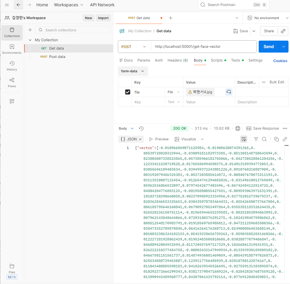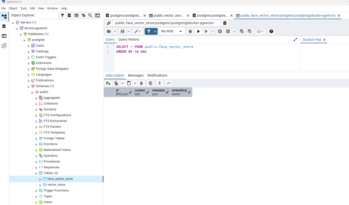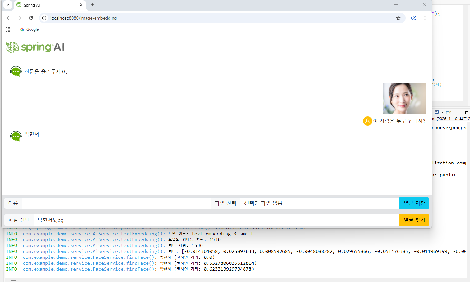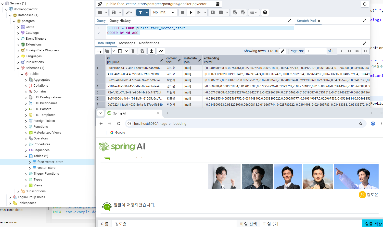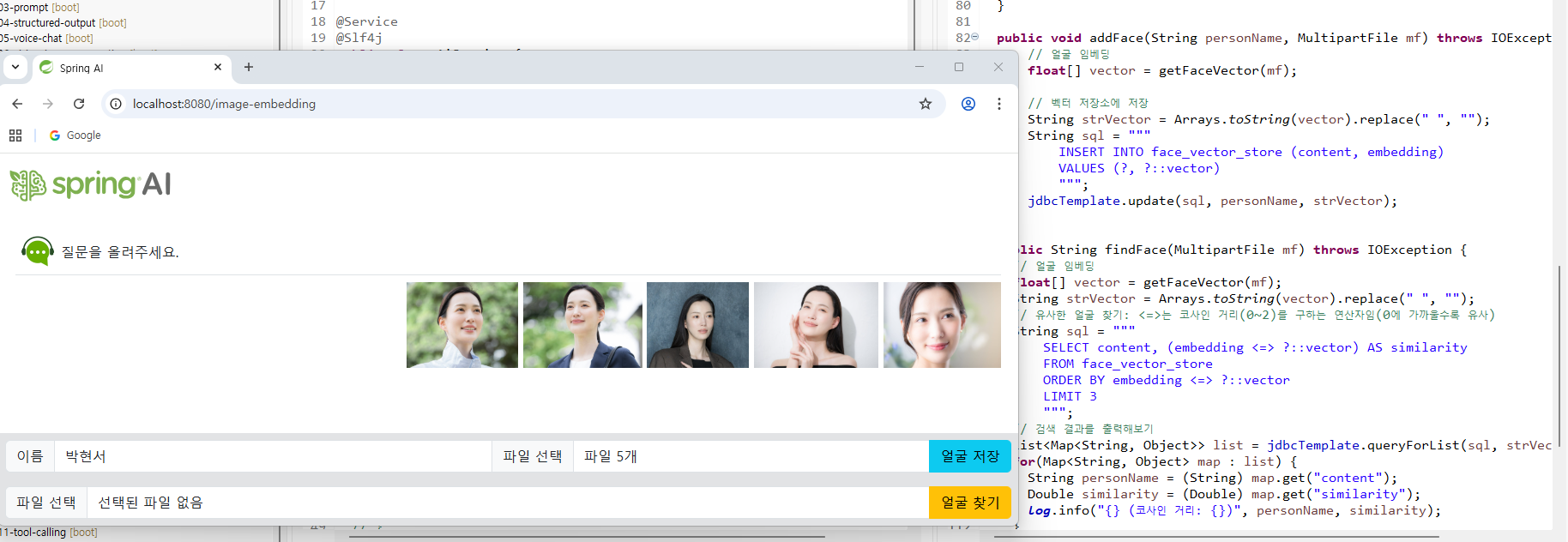// 유사한 얼굴 찾기: <=>는 pgvector 코사인 거리(0~2)를 구하는 연산자임(0에 가까울수록 유사) / socre 와 반대