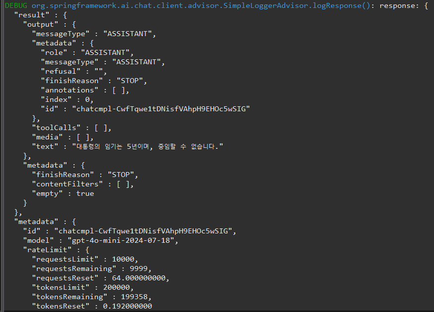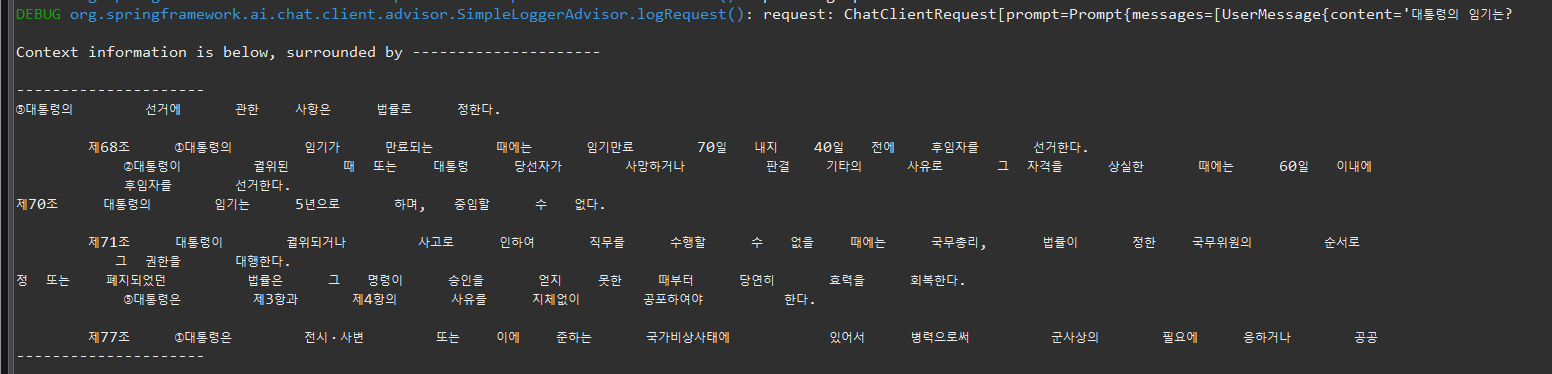 ', metadata={messageType=USER}, messageType=USER}], modelOptions=OpenAiChatOptions: {"streamUsage":false,"model":"gpt-4o-mini","temperature":0.7}}, context={qa_retrieved_documents=[Document{id='d3154ab3-5370-4e14-8c47-fad99c77c803', text='⑤대통령의 선거에 관한 사항은 법률로 정한다.