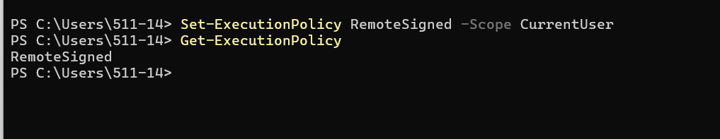 PS C:\Users\511-14> Set-ExecutionPolicy RemoteSigned -Scope CurrentUser