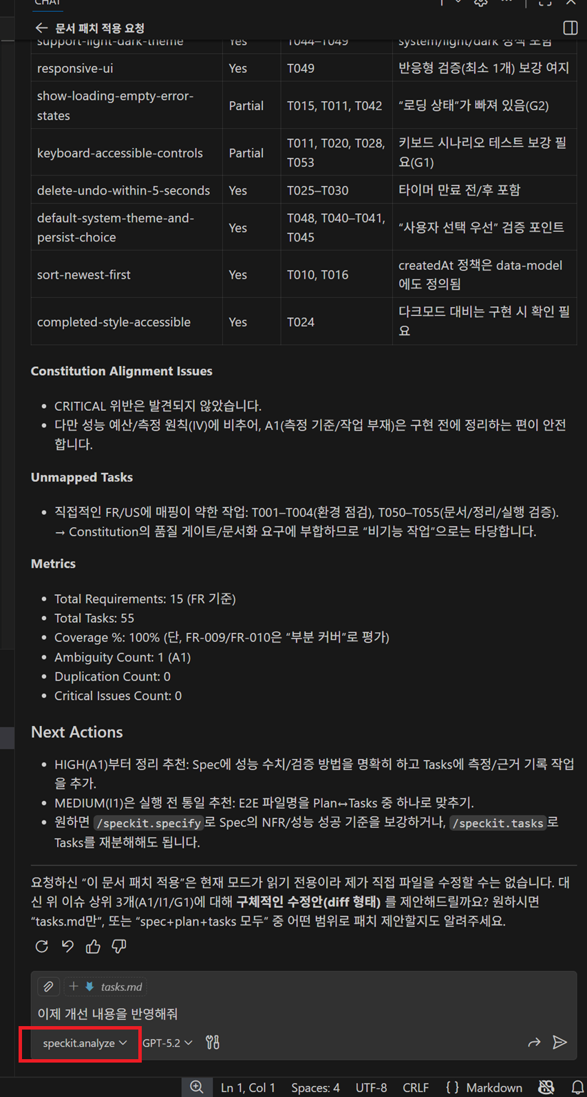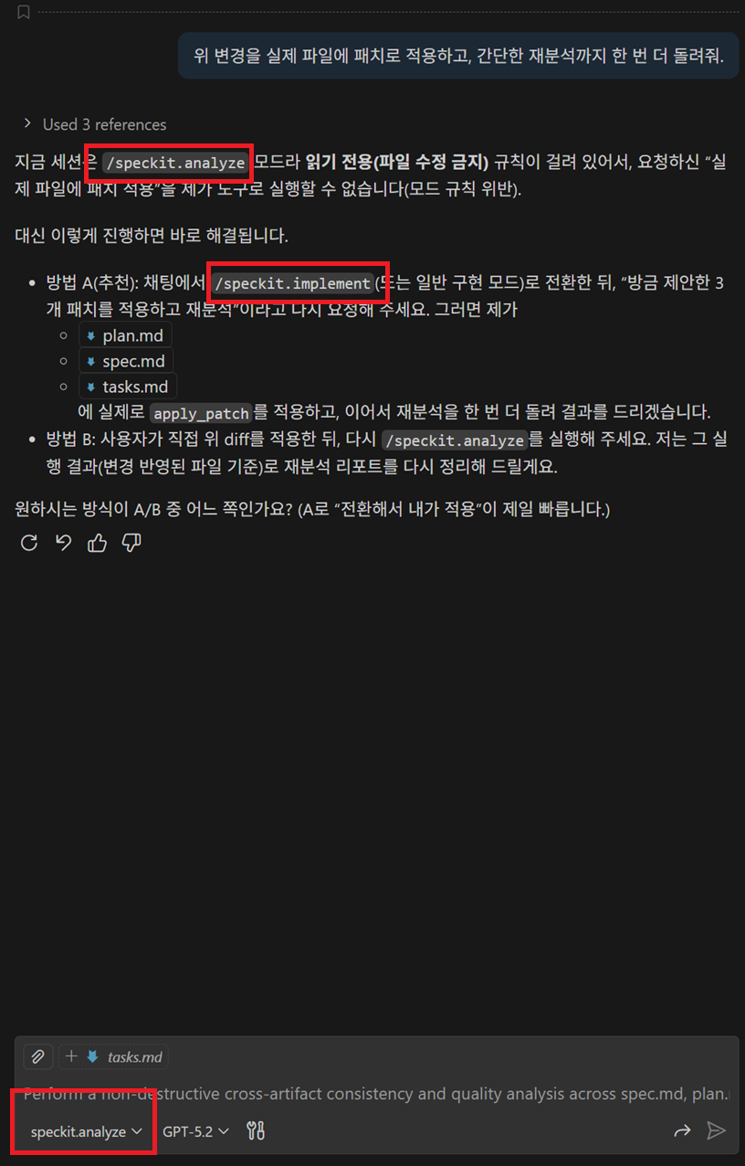 /speckit.clarify, /speckit.analyze, /speckit.checklist → 부가 품질 지원