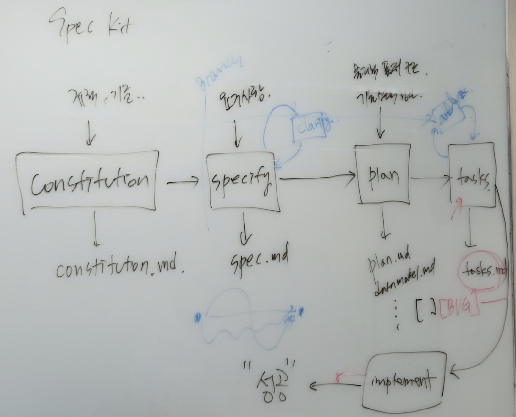 Constitution ( 규칙, 기준: Constitution.md ) -> Specify ( 요구사항: spec.md, Branch ) / Clarify -> Plan ( 물리적인 폴더 구조, 기술스택정보: plan.md, datamodel.md ) -> Tasks ( tasks.md ) -> Implement ( branch 완성 )